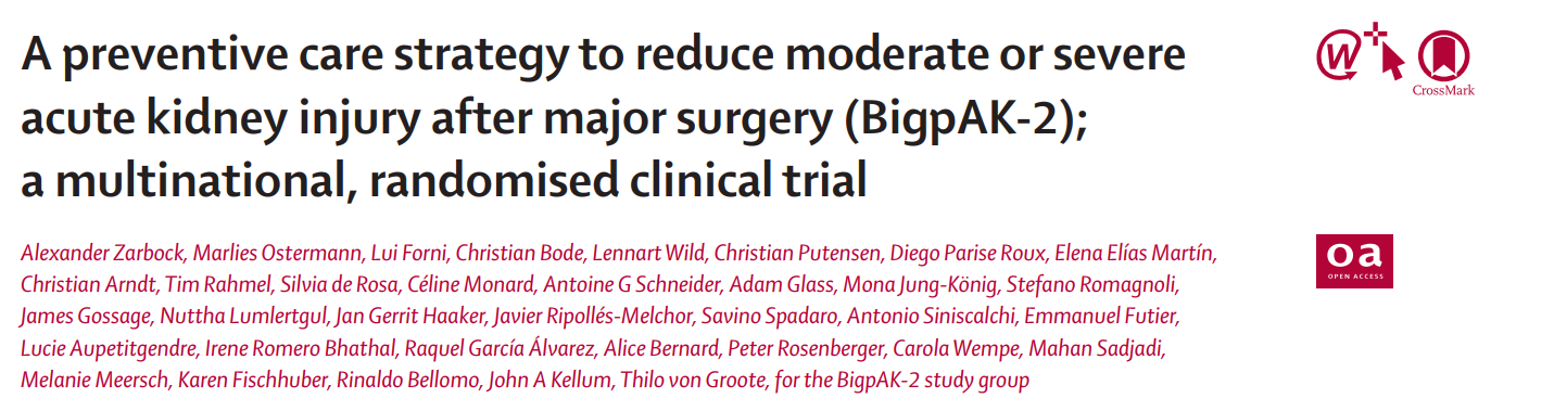 Zarbock, AlexanderVandenberghe, Wim et al.A preventive care strategy to reduce moderate or severe acute kidney injury after major surgery (BigpAK-2); a multinational, randomised clinical trial.The Lancet, Volume 0, Issue 0