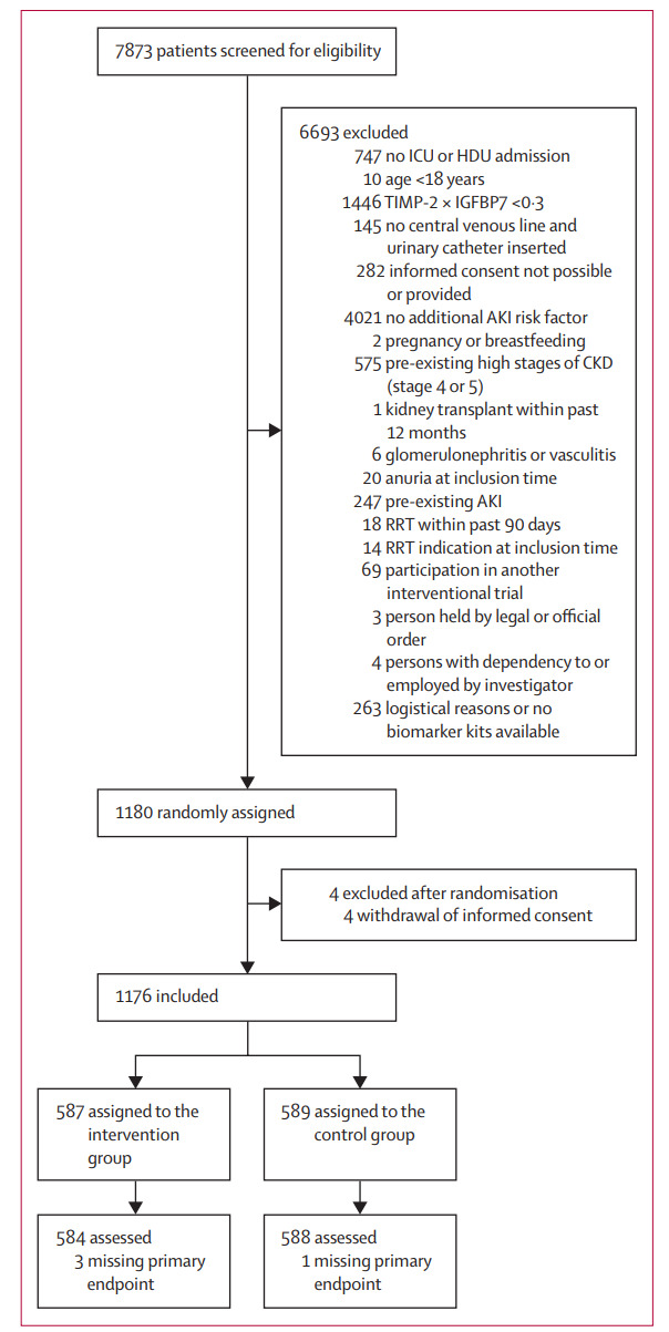 该研究在欧洲34家医院开展,历时近四年,共筛查7873名患者,最终纳入1180名高危患者。这些患者不仅具备至少一项临床风险因素(如年龄≥75岁、术后需血管活性药或机械通气、慢性肾病3期等),还在术后4-18小时内检测出尿液生物标志物TIMP-2×IGFBP7 ≥0.3 (ng/mL)²/1000——这是一个已被多项研究证实能有效预测中重度AKI的指标。