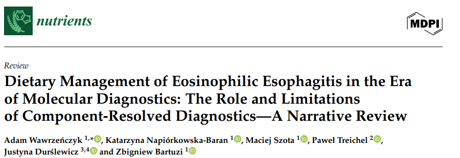 Wawrzeńczyk, A.; Napiórkowska-Baran, K.; Szota, M.; Treichel, P.; Durślewicz, J.; Bartuzi, Z. Dietary Management of Eosinophilic Esophagitis in the Era of Molecular Diagnostics: The Role and Limitations of Component-Resolved Diagnostics—A Narrative Review. Nutrients 2025, 17, 3588. https://doi.org/10.3390/nu17223588