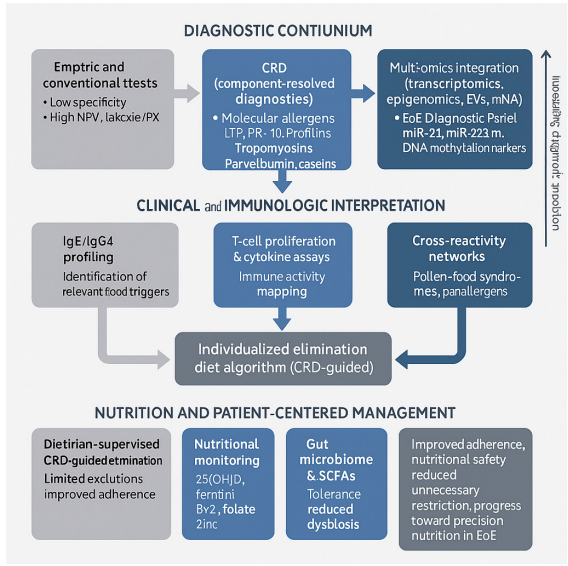 尽管传统过敏检测方法在EoE中的应用效果有限,CRD却展现出独特的诊断价值。例如,Armentia等人开展的研究显示,CRD可在87.6%的EoE患者中识别出特异性过敏成分,其指导下的饮食干预使75.2%的患者症状明显改善。